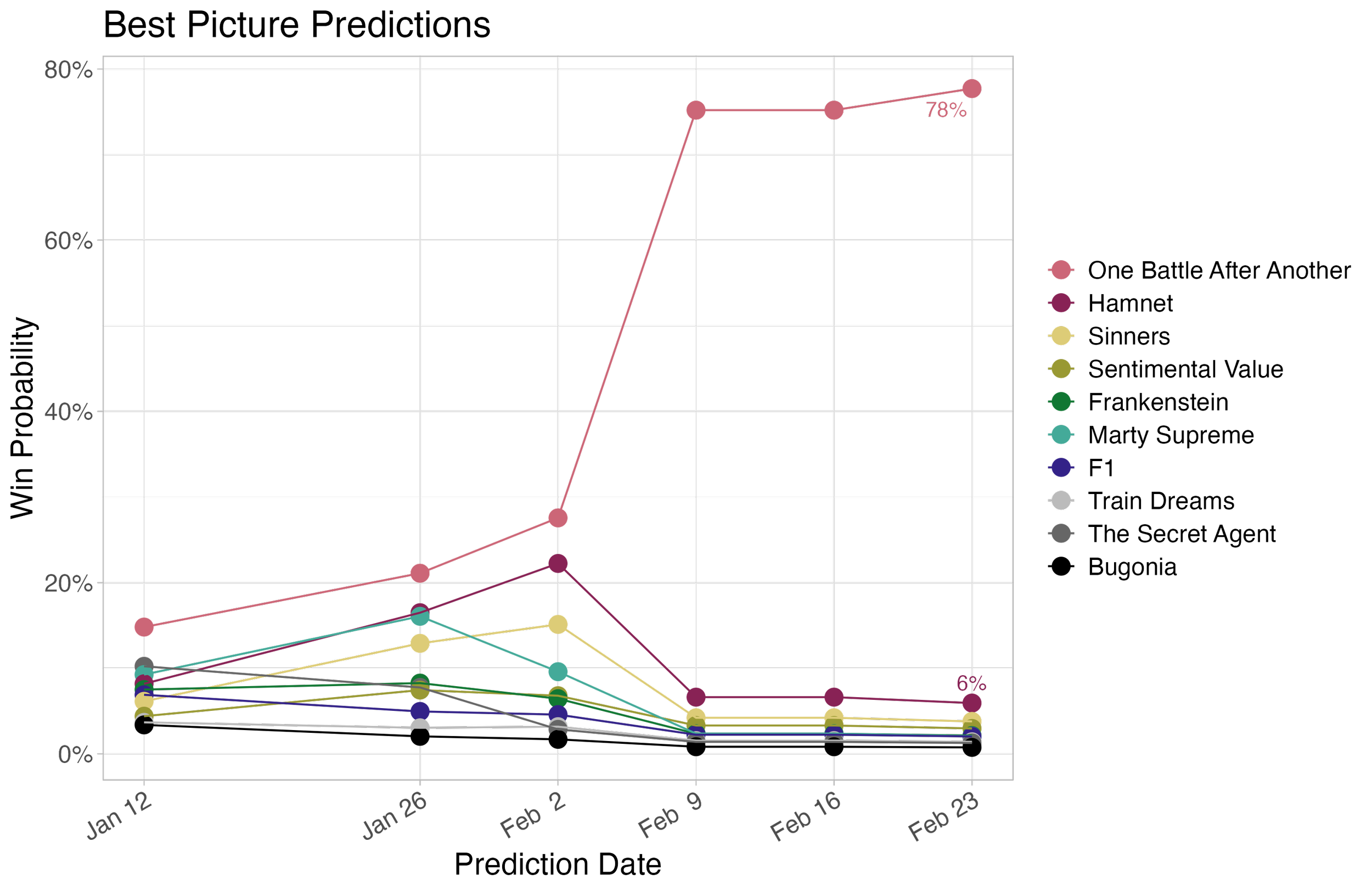 One Battle After Another is the favorite, at about 15% chance of winning. Following it closely is The Secret Agent (10%), followed by Marty Supreme (9%), Hamnet (8%), Wicked: For Good (8%), and Frankenstein (8%).